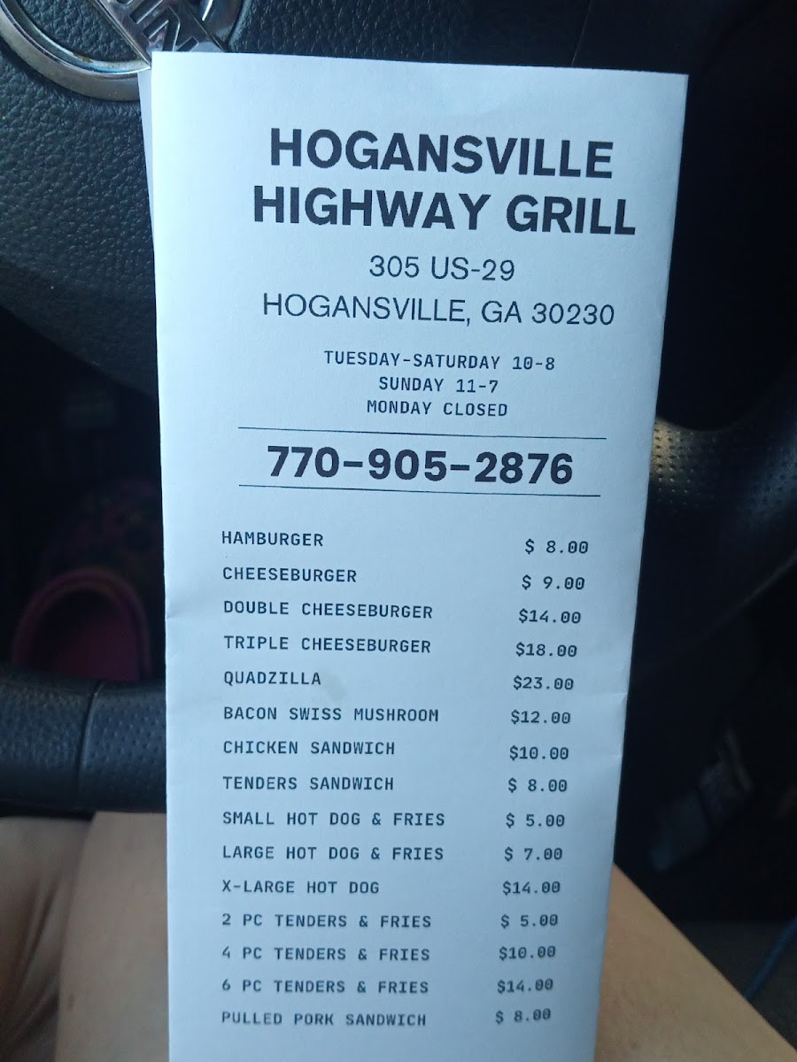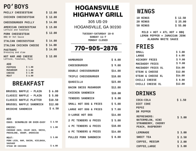 The menu at Hogansville Highway Grill offers a straightforward and satisfying selection of fast food favorites, perfect for casual meals any time of day. Whether you’re stopping by for a quick lunch, a relaxed dinner, or a hearty breakfast, the choices here complement the easygoing, friendly atmosphere that welcomes locals and travelers alike.